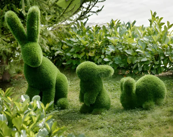 Штучний газон, використаний для створення цих топіарів, не тільки надає роботі природного вигляду, але й забезпечує її довговічність та стійкість до погодних умов. Це робить “Кроликів зі штучного газону” ідеальним декоративним елементом для садів, парків та приватних ділянок, де вони можуть радувати око протягом усього року.