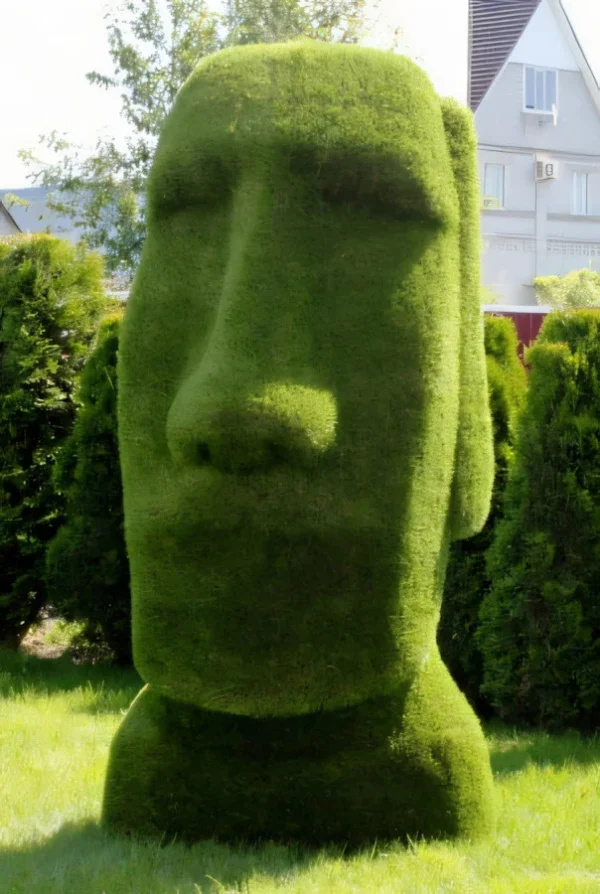 Виконана з живих рослин, ця скульптура є яскравим прикладом майстерності та креативності наших митців. Кожна деталь, від виразного обличчя до характерних рис статуй моаї, відтворена з неймовірною точністю. Така робота не лише прикрашає сад, але й надає йому особливої атмосфери та загадковості.
